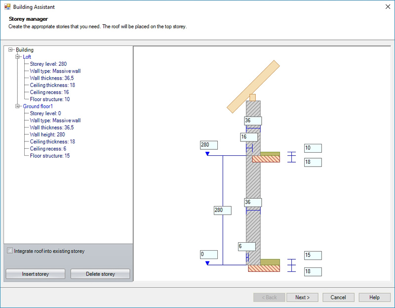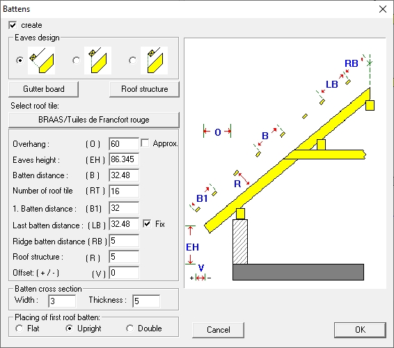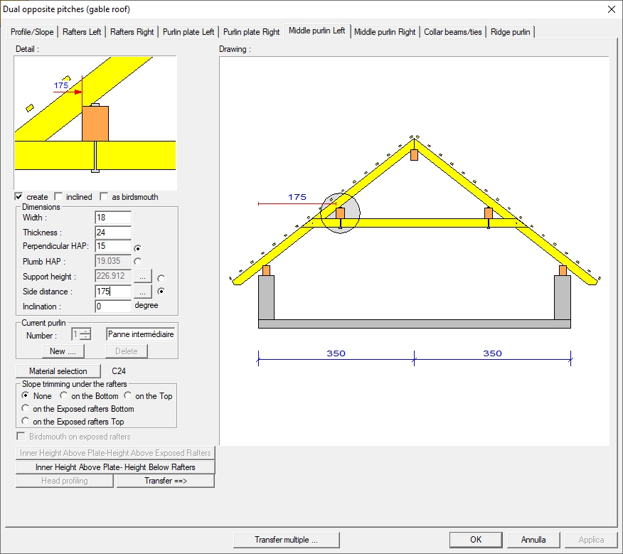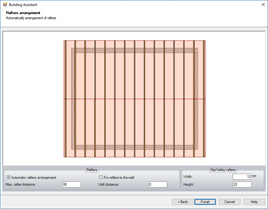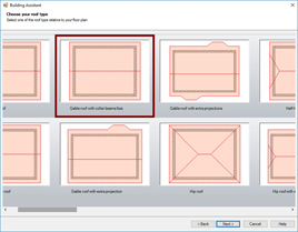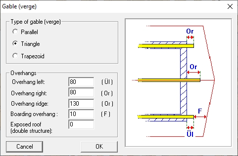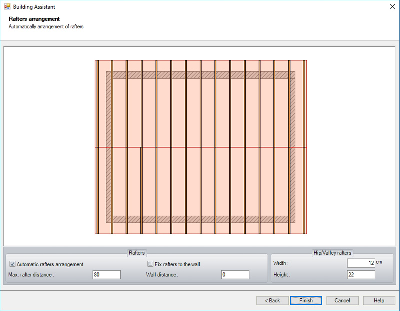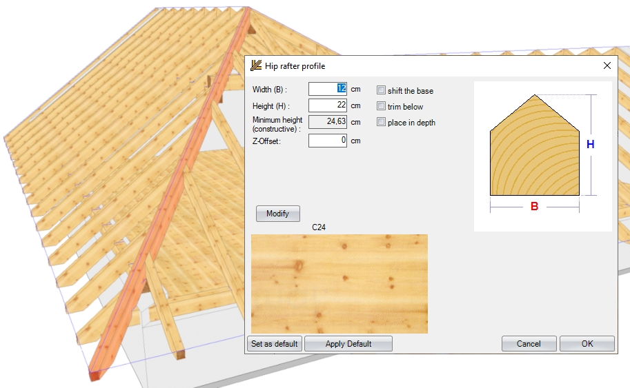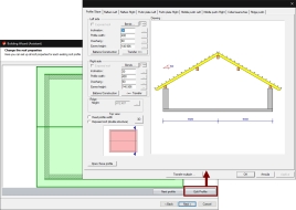 Minden profiladat, például a tetőhajlásszög, a csípőmagasság a födémtől, a gerendák keresztmetszetének részletei (távolságok, méret, illesztések) stb. módosíthatók a tetőre kattintva a Profil szerkesztése gombbal. A szerkesztőben lehetőség van a fő faszerkezetek kezelésére: szarufák, csípő-/völgyszarufák, alap-/alsó-/középső-/gerincsgerincek, gerendák stb.