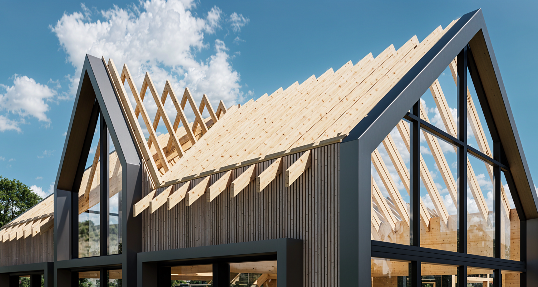 Dupla vázszerkezetű fa tetők szellőztetett tetők tervezéséhez, például a dupla szarufákból és szelemenekből álló kettős váz közvetlenül a tetőasszisztensben történő beállításával.